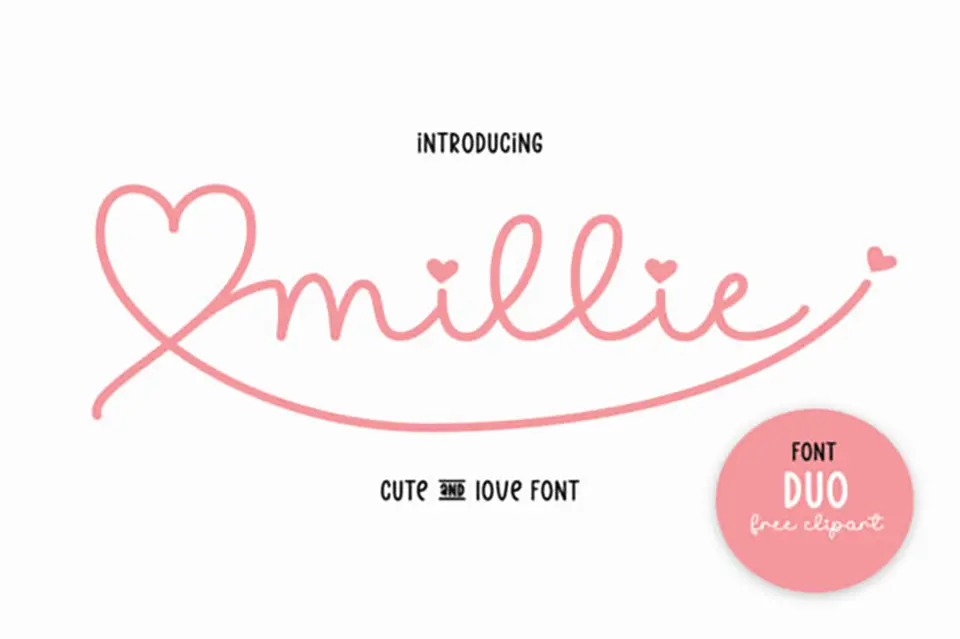 Millie Font Duo is a charming typographic pairing that captures the essence of modern romance and playful elegance. This delightful duo features a flowing script with graceful curves and heart motifs, perfect for projects that require a touch of warmth and affection. The primary script font, with its smooth connecting strokes and playful flourishes, is complemented by an elegant secondary font that enhances its versatility. Designed as a “cute love font,” Millie excels in wedding invitations, greeting cards, social media graphics, and brand designs for businesses with a friendly, approachable aesthetic. Its distinctive heart-shaped characters and decorative elements make it instantly recognizable while maintaining excellent readability across various applications.