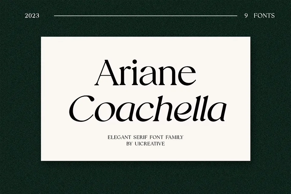 Ariane Coachella Font Family is a modern serif typeface designed by UICreative, blending elegance with playful geometric elements. Characterized by sharp points, subtle ink traps, and a mix of traditional and contemporary serif forms, it offers a versatile aesthetic suitable for both masculine and feminine branding. The font family includes nine weights, from Thin to Extra Bold, with italic variants, ensuring flexibility for headlines, logos, packaging, or editorial design. Its extensive Latin character support and multilingual glyphs make it adaptable for global projects. While free for personal use, commercial applications require a license. Ideal for fashion, luxury branding, or artistic layouts, Ariane Coachella balances sophistication with dynamic visual impact.