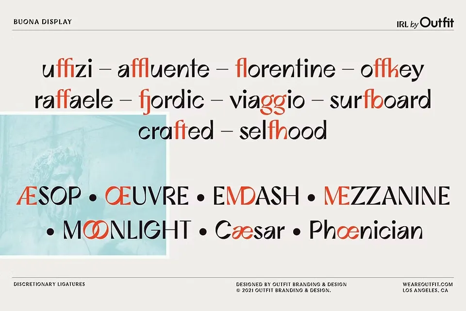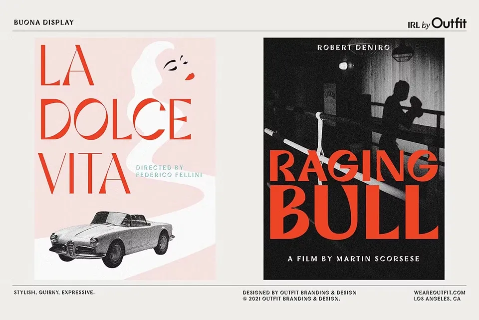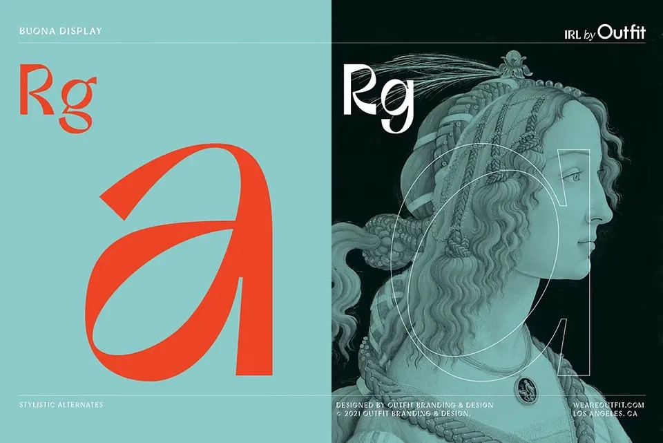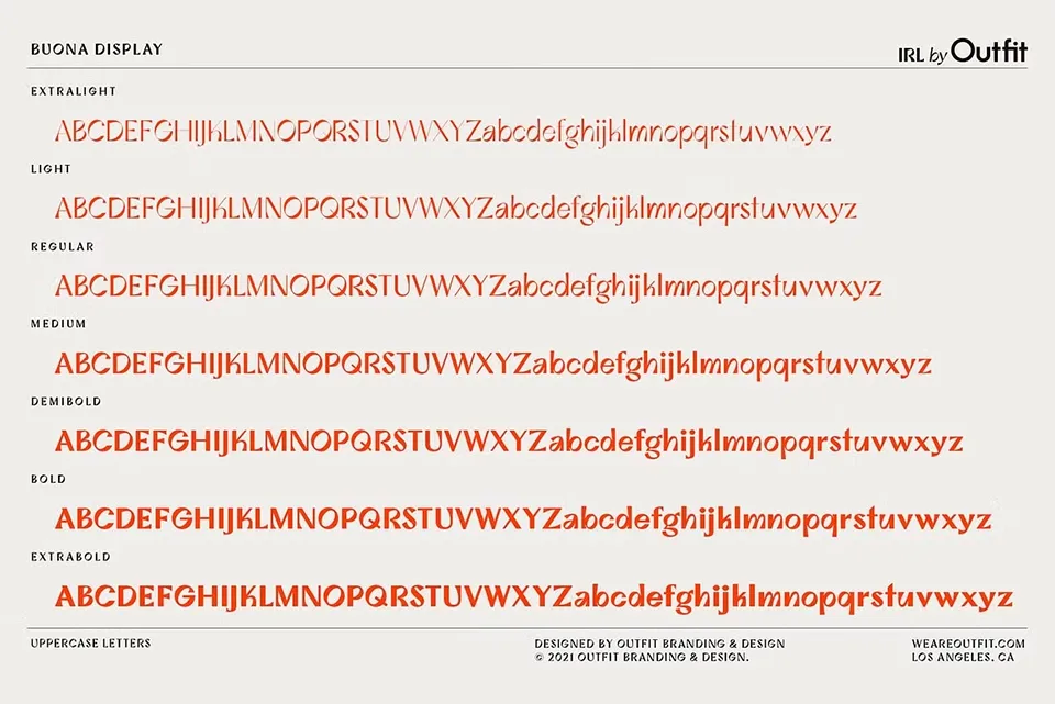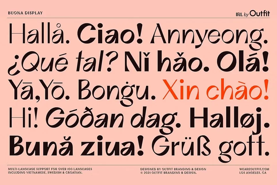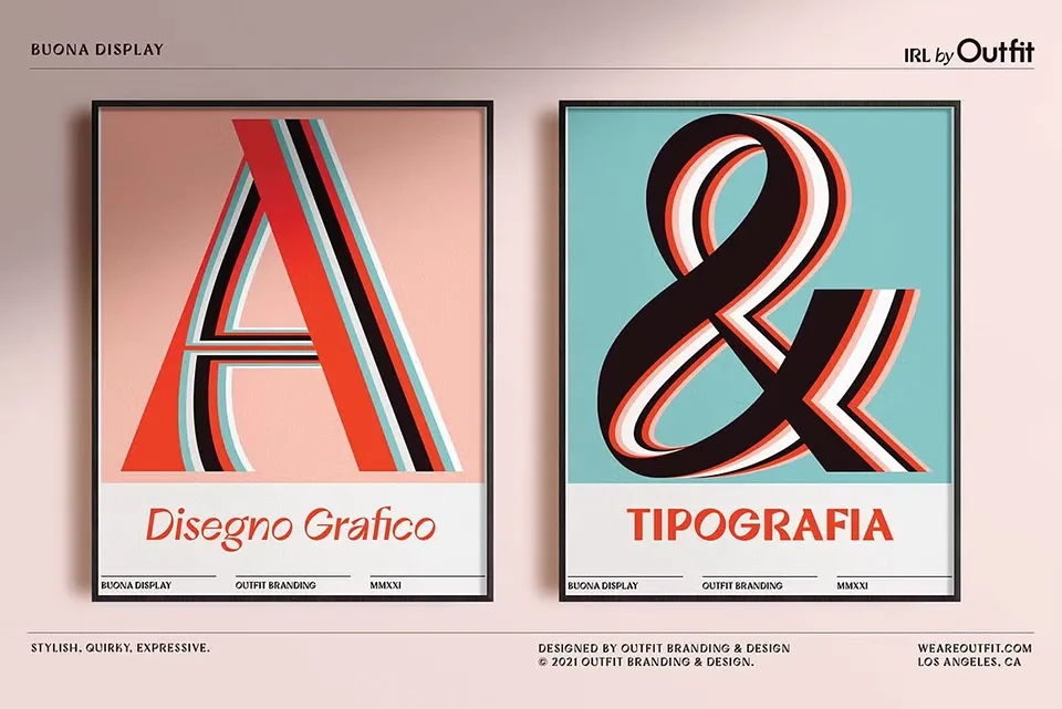 Buona Display Font Family is a bold and expressive sans serif typeface designed by IRL by Outfit. This versatile collection features 14 distinct styles with over 540 glyphs per style, bringing a unique blend of boldness and eccentricity to any creative project. Inspired by Italian typography heritage, Buona Display reverses the classic old-style diagonal axis, creating a vivacious yet refined aesthetic. Its sophisticated details shine at larger sizes, making it perfect for fashion labels, logotypes, editorial layouts, and billboard signage. With its rich OpenType features including ligatures, stylistic alternates, and multiple digit sets, Buona Display delivers contemporary style with subversive flair.