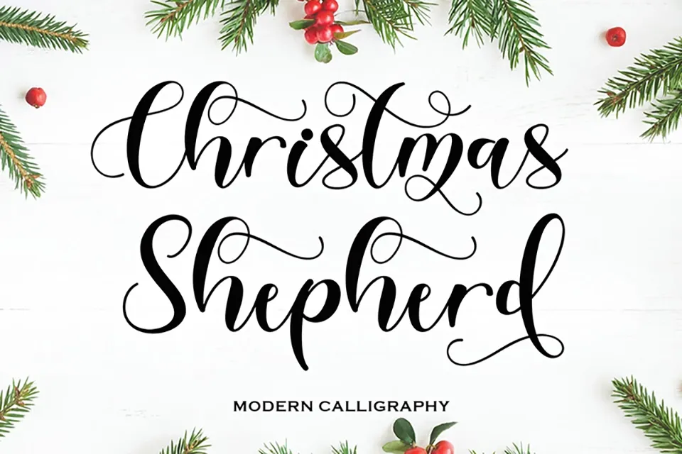 Christmas Shepherd Font is a festive and sweet calligraphy typeface with characters that dance along the baseline. It will add a luxury spark to any design project that you wish to create! This font is PUA encoded which means you can access all of the amazing glyphs and ligatures with ease!
