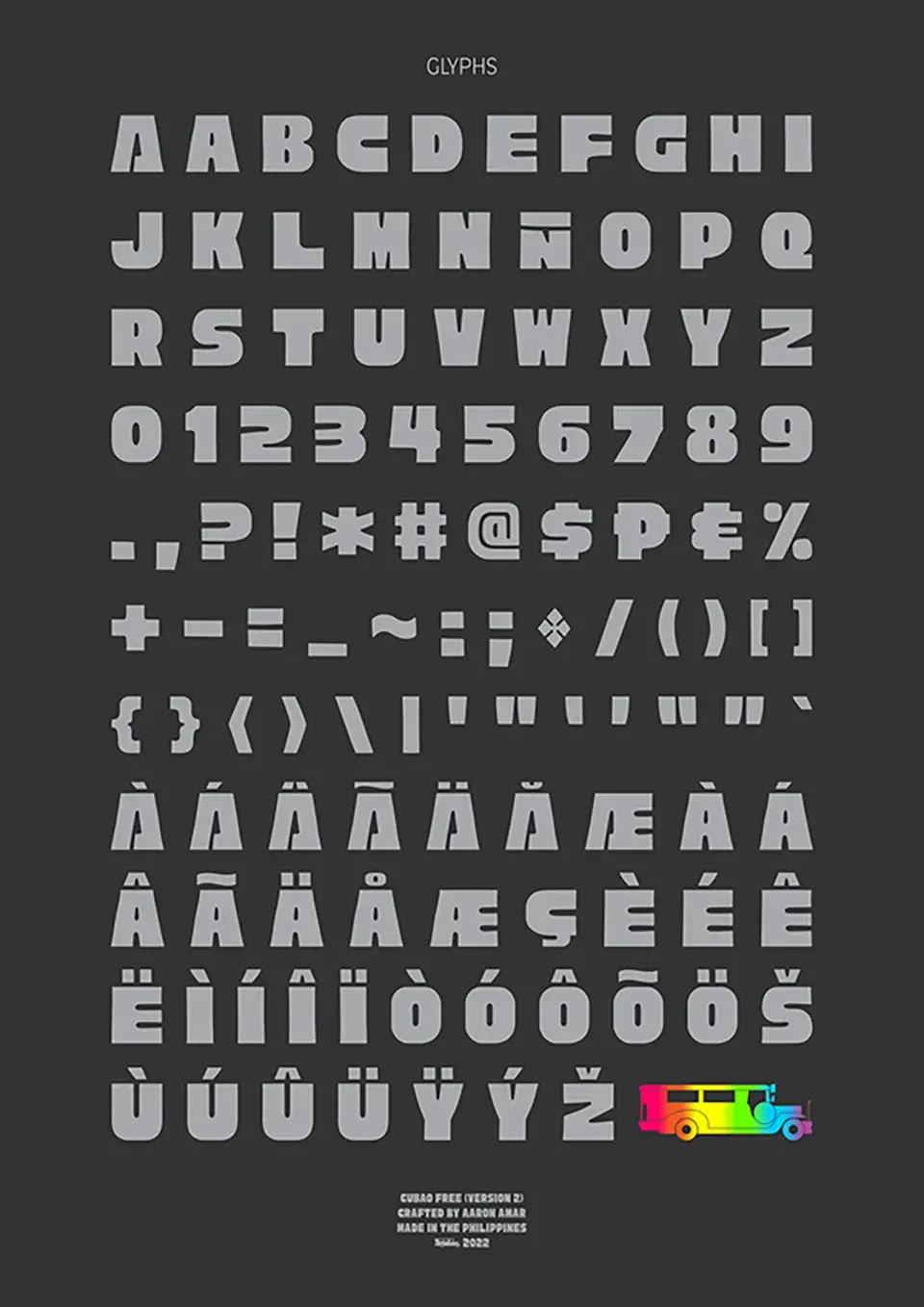 Cubao Font is a vibrant free display typeface designed by Aaron Amar, inspired by the colorful signboards found on jeepneys and other transport vehicles in the Philippines. This bold and fun font captures the essence of urban life, making it an ideal choice for eye-catching signage and graphic design projects. With its three distinct styles—Narrow, Regular, and Wide—Cubao Font is perfect for various applications, especially in Filipino culture. Its playful design and readability make it suitable for both digital and print media.