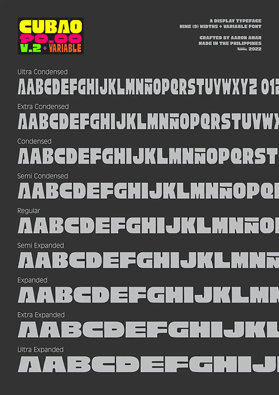 Cubao Font comes in three styles: Narrow, Regular, and Wide.