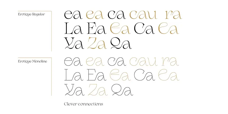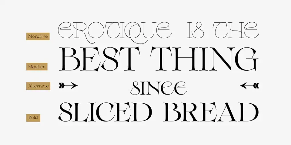 Erotique comes in Regular, Medium, Bold, and Monoline weights.