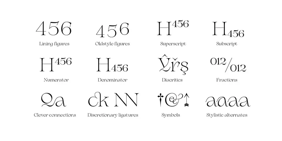 - Advanced OpenType Features: Includes stylistic alternates, ligatures, and swash forms.