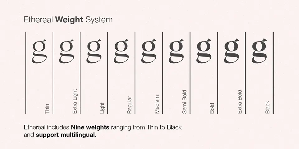 Ethereal Font Family, crafted by Kereatype, is a modern and elegant serif typeface that exudes sophistication and style. Featuring nine versatile weights, it seamlessly blends contemporary design with timeless elegance, making it ideal for a wide range of creative applications. From branding and logo design to editorial projects and wedding invitations, Ethereal offers a perfect balance of refinement and functionality. Enhanced with multilingual support, stylistic alternates, ligatures, and PUA encoding, this font family ensures both aesthetic appeal and usability. Whether you’re aiming for classy logos or striking typography, Ethereal delivers a distinctive charm that elevates any project.