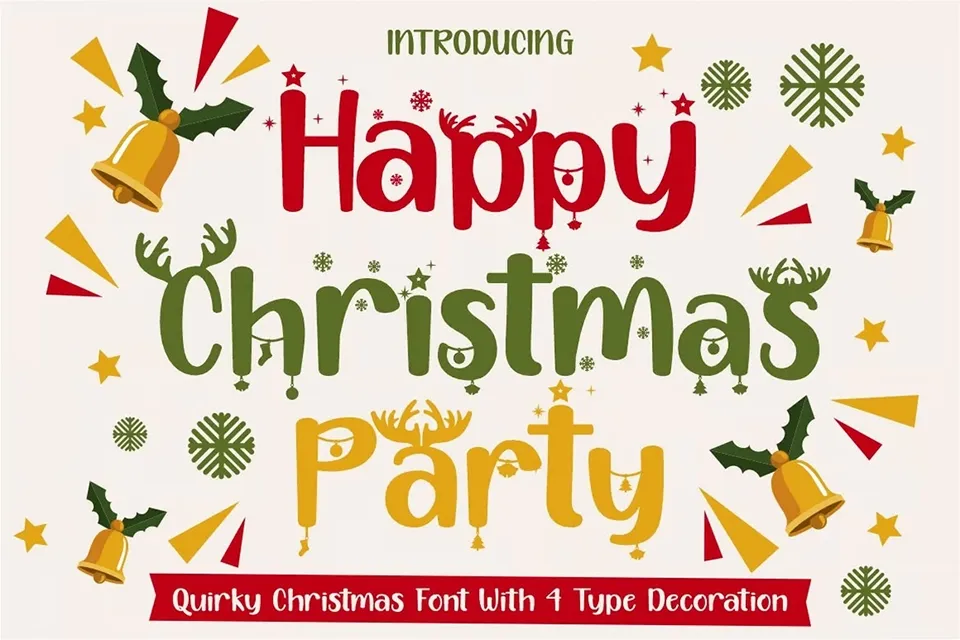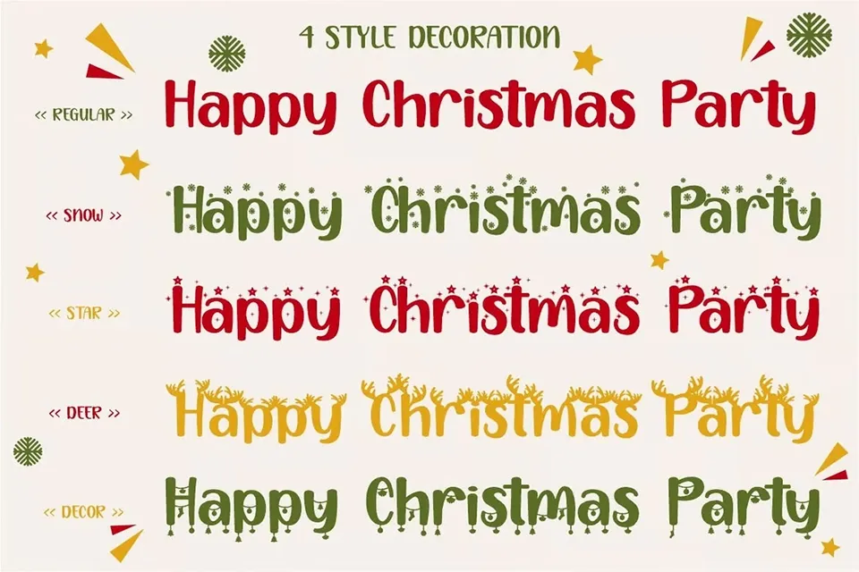 Happy Christmas Party Font is a delightful display typeface that embodies the festive spirit of the holiday season. This playful and quirky typeface was specifically crafted for Christmas celebrations and holiday-themed designs. The font features five distinct decoration variations, making it versatile for various creative applications. Its whimsical character and decorative lettering style make it perfect for creating cheerful holiday cards, festive invitations, seasonal marketing materials, and other Christmas-themed projects. The font’s unique personality adds a touch of warmth and joy to any design, capturing the magical essence of the Christmas season while maintaining readability and visual appeal.
