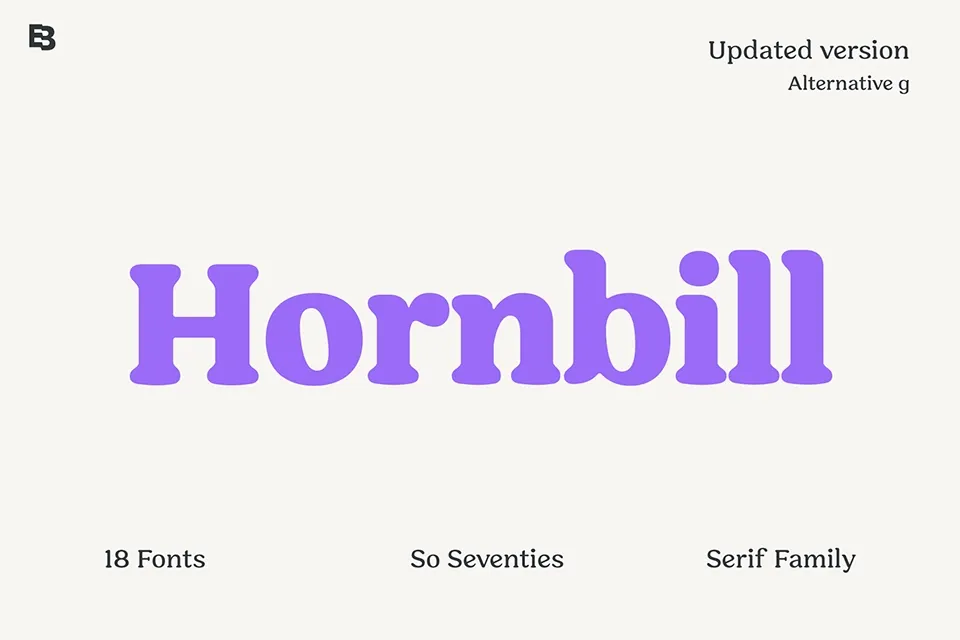 Hornbill Font Family is an elegant soft serif typeface inspired by 1970s retro styles, designed by Eko Bimantara. The family consists of 18 versatile styles ranging from thin to black, each with matching italics. Its clean and adaptable letterforms make it suitable for both display and reading purposes, offering a perfect balance of warmth and legibility. The font features a unique alternative lowercase ‘g’ letter accessible through opentype features. Hornbill’s retro-inspired design combined with modern versatility makes it an excellent choice for various applications including branding, editorial design, packaging, magazines, books, and web design.
