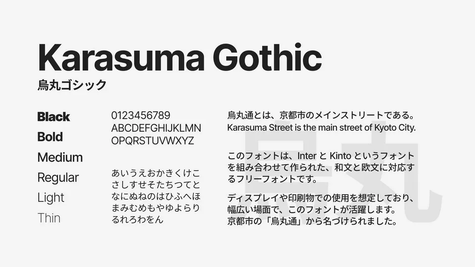 Karasuma Gothic Font Family is a versatile Japanese sans-serif font family available for free. This typeface offers a clean, modern aesthetic characteristic of Japanese Gothic styles. It comes in multiple weights, including Light and Black, with variations like Italic, providing flexibility for diverse design needs. Karasuma Gothic is well-suited for both digital and print applications, effective in headlines, body text, branding, and user interfaces, especially where multilingual support is beneficial. Its clear legibility and contemporary feel make it a valuable addition for designers seeking a functional and stylish sans-serif typeface.