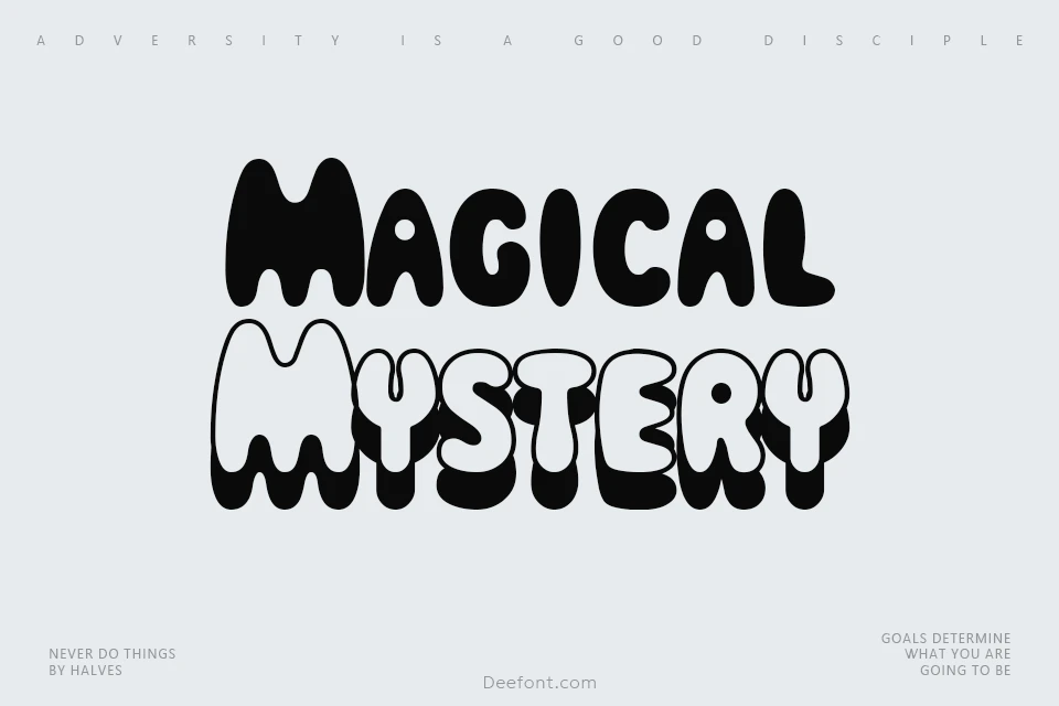 Magical Mystery Tour Font font is a bold and playful typeface inspired by the iconic lettering used on The Beatles’ 1967 record sleeve of the same name. This distinctive font family includes two main styles: Plain and Outline Shadow versions. Featuring rounded, bubbly characters with a uniform stroke width, the font conveys a whimsical and fun aesthetic that captures the psychedelic spirit of the late 1960s. The typeface includes 240 defined characters and supports multiple languages, making it versatile for various creative projects. Its bold, rounded design and retro appeal make it particularly suitable for projects seeking to evoke a nostalgic, playful atmosphere.