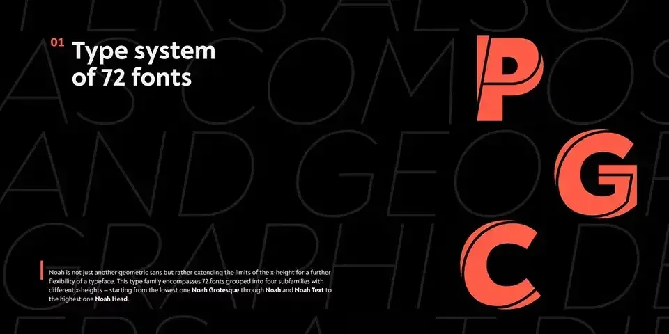 Noah Font Family is a versatile geometric sans-serif typeface designed by Fontfabric. It extends the limits of x-height, offering exceptional flexibility across various typographic applications. The family comprises 72 fonts grouped into four subfamilies with different x-heights: Noah Grotesque, Noah, Noah Text, and Noah Head. Its geometric structure, combined with normal width proportions, moderate contrast, and vertical stress, makes it suitable for a wide range of uses. Noah Text is optimized for long-form content, while Noah Head is perfect for impactful headlines. The family supports Extended Latin and Cyrillic scripts, covering over 130 languages.