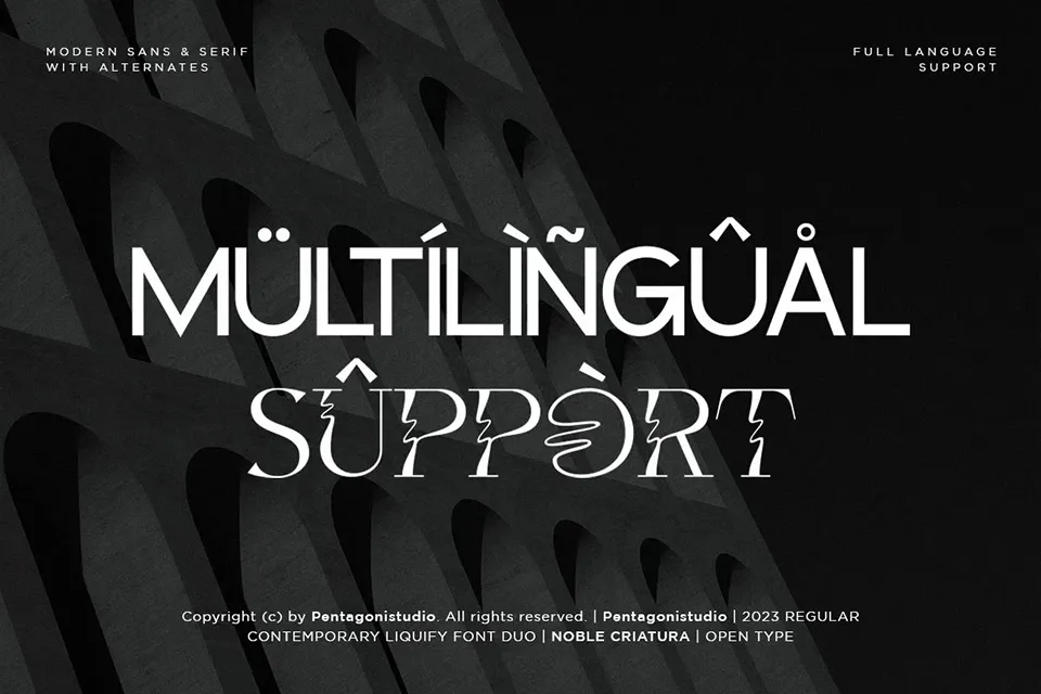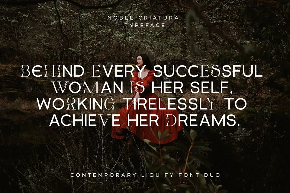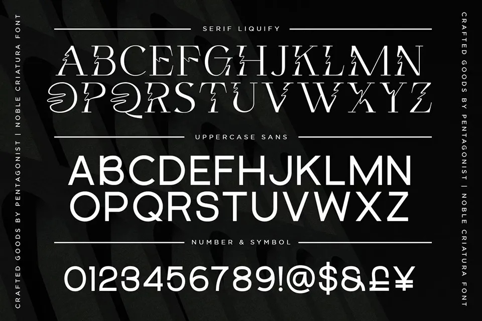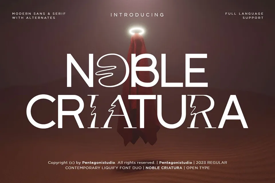 Noble Criatura Font is a distinctive display typeface that combines sans-serif and serif typefaces in a unique design. This whimsical and quirky typeface features a blend of geometric and decorative elements, with uppercase letters showcasing a striking angular design. Perfect for magazine layouts, book designs, apparel, logos, and branding projects, Noble Criatura brings a fresh and elegant aesthetic to any creative work. The font is PUA encoded, making it easy to access all glyphs and ligatures. Its versatile nature and decorative characteristics make it an excellent choice for designers looking to add character and sophistication to their projects.