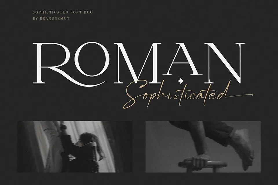 Roman Sophisticated Font Duo is a luxurious typeface package combining a signature script and a serif font, perfectly paired for sophisticated design projects. This elegant duo features OpenType capabilities with ligatures, alternates, numbers, and punctuation marks, supporting multiple languages. The versatile font pair is ideal for creating high-end designs including headings, logos, branding materials, magazines, product packaging, and invitations.