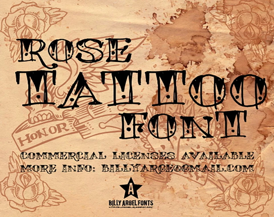 Rose Tattoo Font is a throwback font design that draws inspiration from the diverse array of tattoo font styles etched onto skin worldwide. This retro-style typeface captures the essence of traditional tattoo artistry. Notably, the font exclusively features letters, omitting punctuation or numerical characters commonly found in standard fonts.