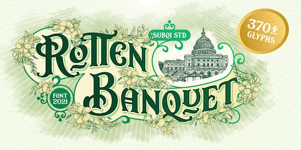 Rotten Banquet Font, our first victorian display font. This font inspired by 1800s typography design with some modern touch at it. We made this font without too much swashy efefct on the letterform. Just gave it two bold ripple floral effect at the tail is enough. So this font will more readable and not too complicated thus you could make any kind of projects with this font. In the preview we give you a sample ideas. We made it with one style design for the continuity but of course you could make your own style display for your own project purposes. This font contained with 370+ total glyphs. Each uppercase and lowercase have their own stylistic alternate at least one.