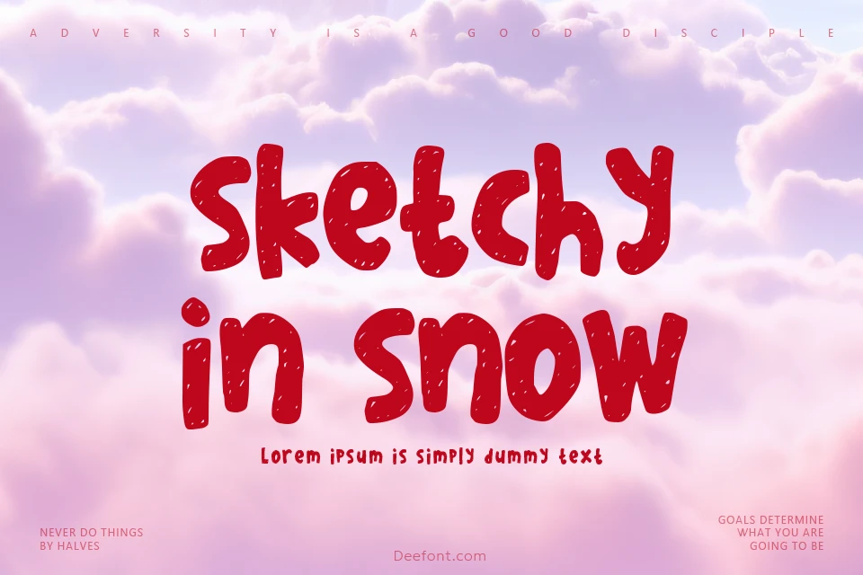Sketchy In Snow Font is a whimsical, bold display typeface designed by Abo Daniel Studio. Its thick, cartoonish letters evoke a playful and cheerful atmosphere, making it an excellent choice for projects aimed at children or those that require a light-hearted touch. The font’s unique style captures the essence of snowflakes and winter fun, adding a delightful flair to any design. Ideal for invitations, posters, and branding materials, Sketchy In Snow ensures that your text stands out with its charming aesthetic. While it is free for personal use, a commercial license is available for those looking to incorporate it into professional projects.