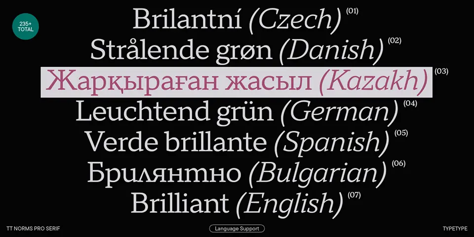 With 1,380 glyphs per style and support for 235+ languages, it excels in multilingual projects. Technical enhancements include 31 OpenType features for advanced typographic control. Its neutral yet refined aesthetic makes it ideal for editorial design, premium branding, digital interfaces, and cultural publications. The font’s high readability at small sizes and dynamic italics allow effective accentuation without compromising legibility, serving as both a standalone workhorse and harmonious pair with its sans serif counterpart.