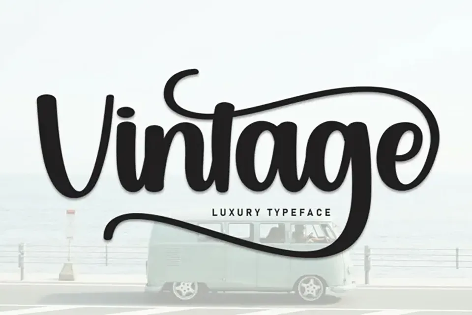 Vintage Calligraphy is presented as a luxury script typeface, characterized by its bold, flowing letterforms. The smooth, connected strokes create an elegant yet impactful appearance, suggestive of modern calligraphy with a vintage influence. Prominent, sweeping swashes extend gracefully from letters like the ‘V’ and ‘e’, enhancing its decorative and luxurious feel. This font balances a classic calligraphic spirit with substantial weight, making it ideal for high-end branding, sophisticated logos, elegant invitations, eye-catching headlines, and designs requiring a bold, flowing script that conveys both nostalgia and modern luxury.