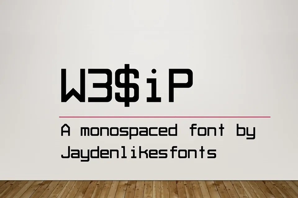 W3$iP Font is a distinctive monospaced typeface created by designer Jayden Marrero (also known as Jaydenlikesfonts) in 2021. Originally developed using fontstruct.com, this font features a unique random name and supports 19 different languages, including English, Russian, and various African languages. The font family includes a regular weight version with 101 glyphs and uses Unicode encoding for broad compatibility. W3$iP is designed with a semi-light weight and medium width, making it suitable for various design applications. The font is freely available and allows embedding for preview and printing purposes.
