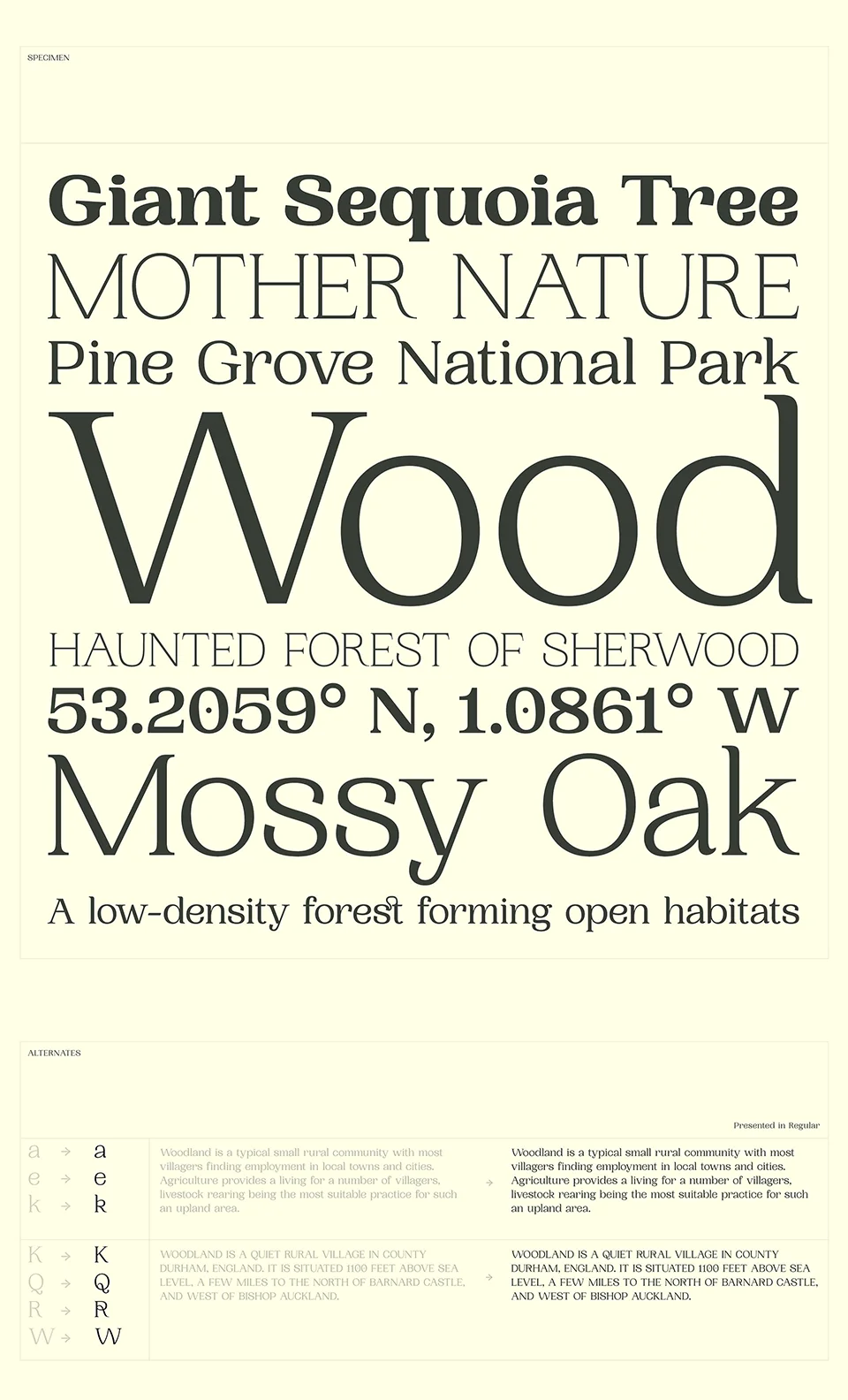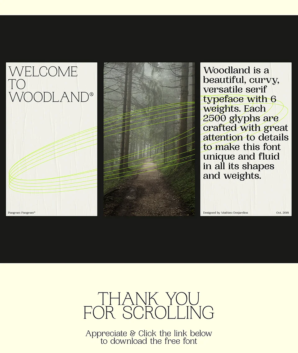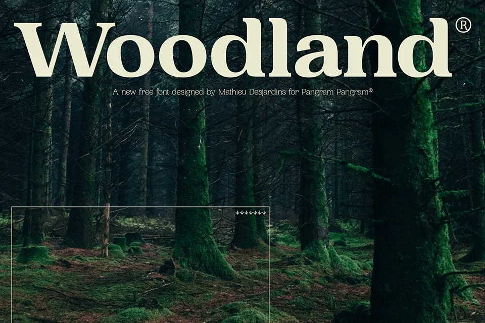 Woodland Font was designed by Pangram Pangram.