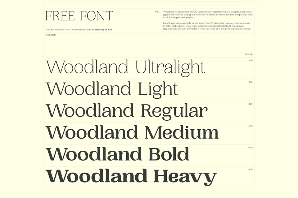 Woodland Font is free for personal use but requires a license for commercial applications. Users must purchase a license for any business-related projects, including web and print.