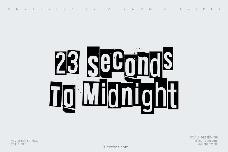 23 Seconds To Midnight is a unique distorted display font suitable for bold, eye-catching designs. Featuring playful, irregular shapes, it brings a sense of urgency and energy to posters, headlines, and themed graphics. Its creative and grunge-inspired appearance makes it a great choice for creative projects that need a standout visual impact.