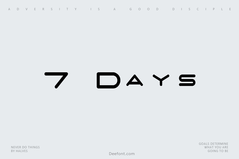 7 Days is a techno and display font designed by Jakob Fischer (Pizzadude), featuring a distinctive geometric and futuristic style with multiple variants including regular, oblique, fat, rotated versions. This playful and contemporary typeface offers 174 glyphs and is ideal for eye-catching headlines, posters, and creative projects. The font combines a quirky aesthetic with modern appeal, making it suitable for various design applications ranging from entertainment to digital media.
