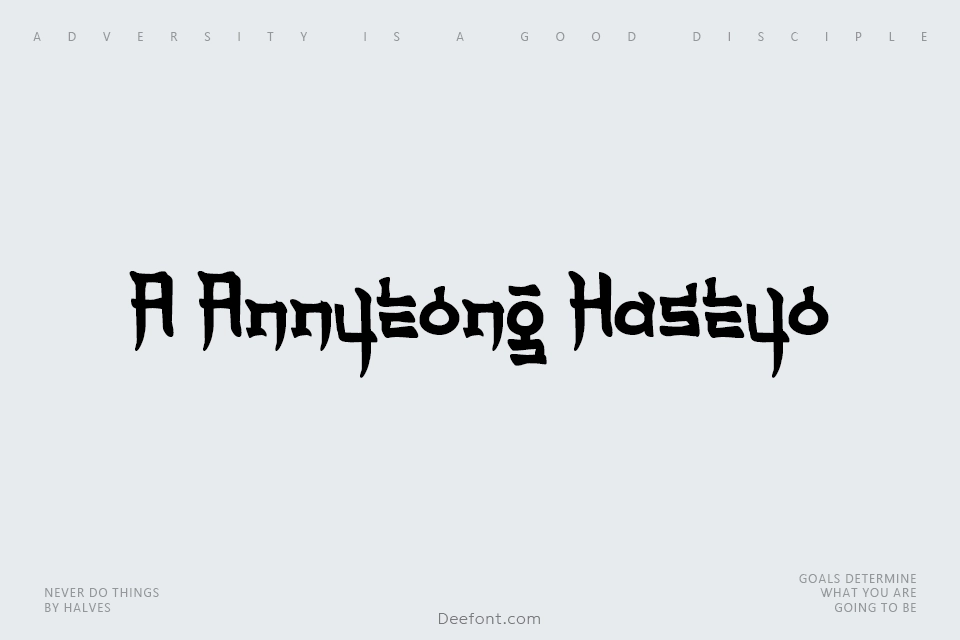 A Annyeong Haseyo is a distinctive Korean-inspired display font that captures the essence of Hangul calligraphy with Latin characters. Created by designer Wahyu Eka Prasetya, this font features bold, angular strokes with a hand-carved tribal aesthetic that mimics traditional Korean brush lettering. The typeface showcases sharp geometric forms and irregular shapes that evoke the stylized appearance of Korean writing systems, making it perfect for restaurant branding, cultural event posters, K-pop inspired designs, and creative projects seeking authentic Asian flair. With its striking visual presence and unique character, this font delivers both cultural authenticity and contemporary appeal for logos, social media content, product packaging, and artistic displays.