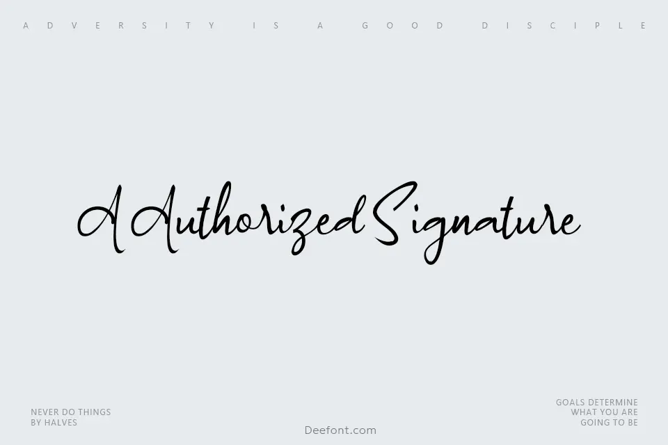 A Authorized Signature is an elegant handwritten script typeface that combines fluid, organic letterforms with refined sophistication. Its graceful curves and natural pen-stroke qualities make it ideal for signature-style applications, branding projects, formal invitations, and personalized design work. The font’s authentic handwriting aesthetic brings warmth and personality to any creative project requiring a touch of human elegance and contemporary sophistication.