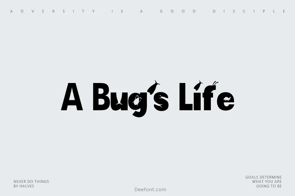 A Bug’s Life Font is a playful and whimsical display typeface inspired by the 1998 Pixar Animation Studios film. Featuring bold, rounded characters with unique insect-like elements integrated into the design, each letter is adorned with bug illustrations, antennae, and quirky details that capture the fun and adventurous spirit of the movie. The uppercase letters are solid and strong, while lowercase letters incorporate more animated elements, giving the font a lively feel. Perfect for children’s books, themed party invitations, cartoon branding, playful posters, and educational materials, this decorative font adds a touch of humor and creativity to any project requiring a whimsical and entertaining aesthetic.