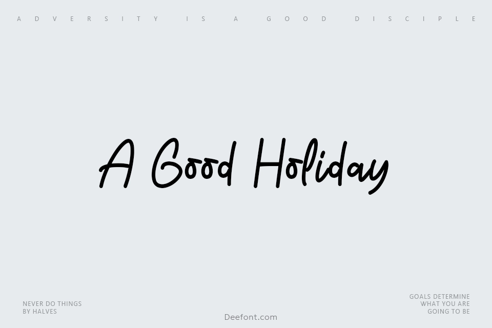 a Good Holiday is an elegant handwritten script font designed with a charming, festive aesthetic. This typeface features smooth flowing characters perfect for creative projects including logos, invitations, greeting cards, and social media designs. The font delivers a personal, artistic touch to any design work while maintaining excellent readability across various applications and devices.