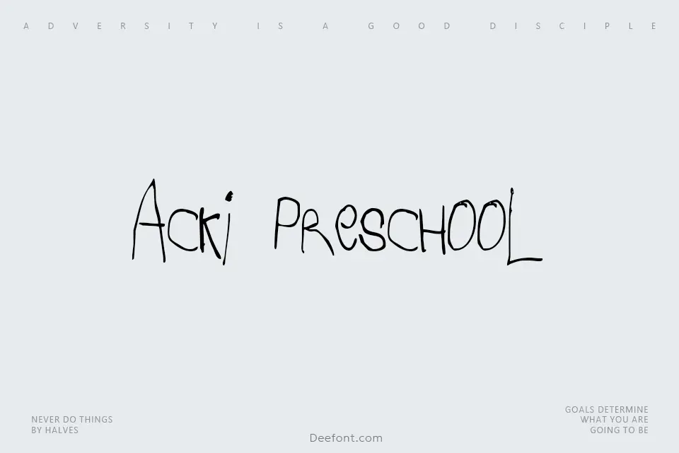 Acki Preschool is a charming handwritten font that captures the authentic essence of childlike penmanship with its playful, irregular strokes and varying line weight. The typeface features rounded lowercase letters and casual uppercase characters, creating a whimsical aesthetic ideal for children’s books, birthday invitations, educational materials, poster designs, and greeting cards. Its genuine, unpretentious style adds personality and warmth to any design project requiring a youthful, endearing touch. With 81 meticulously designed glyphs, this font delivers consistent childlike charm across diverse typographic applications.
