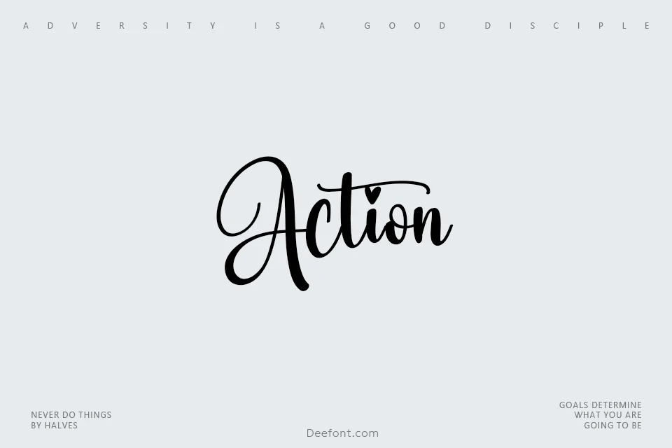 Action is a modern calligraphy script font designed with beautiful creative strokes perfect for wall displays, wedding invitations, social media post logos, advertisements, product packaging, product designs, labels, photography, watermarks, invitations, and stationery. This font combines elegant styling with contemporary charm, making it ideal for creative projects that demand sophisticated handwriting aesthetics and professional presentation.
