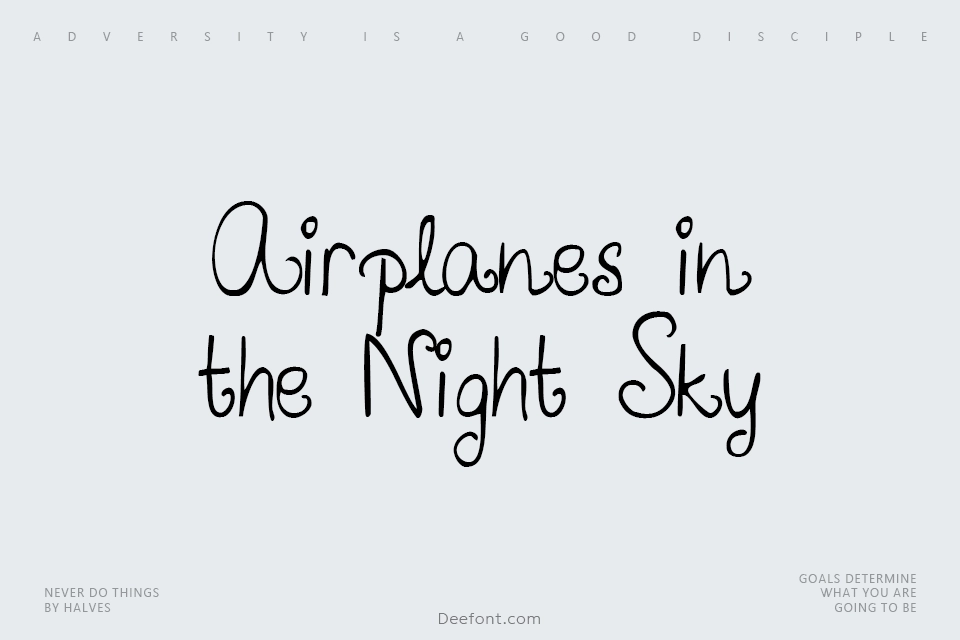 Airplanes in the Night Sky is a delightful handwritten font designed by Kimberly Geswein, featuring flowing sans-serif characteristics with whimsical script-like elements. This charming typeface authentically captures the essence of genuine handwriting, offering a dreamlike and inviting quality perfect for creative typography projects. With its unique personality and elegant curves, it transforms any text into a whimsical design that feels both playful and sophisticated.