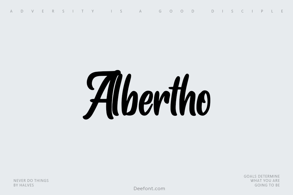 Albertho is a bold and expressive script typeface featuring smooth, flowing characters with elegant curves and strong strokes. This playful yet sophisticated font combines romantic calligraphy elements with modern sensibility, delivering a handcrafted feel through slightly irregular lines. The interconnected letters create a sense of movement and fluidity, making it ideal for logos, invitations, greeting cards, branding projects, and creative social media graphics. With its medium contrast and decorative style, Albertho brings vintage charm and contemporary flair to any design project.