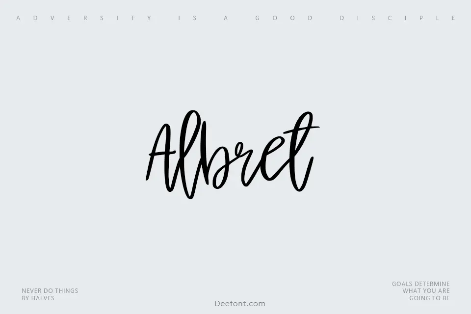 Albret is an elegant and sophisticated handwritten script typeface that brings refined charm to any design project. With its smooth, flowing cursive strokes and carefully crafted letterforms, Albret delivers a pleasant and alluring aesthetic ideal for wedding invitations, greeting cards, logos, posters, packaging, and display titling. The font features comprehensive support for European languages including uppercase, lowercase, standard punctuation, and special characters. Perfect for designers seeking to add artistic elegance and visual sophistication to personal creative endeavors.