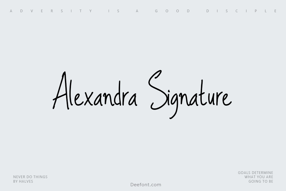Alexandra Signature is a stylish handwritten script font designed to infuse projects with a personalized, elegant touch. With its smooth strokes and authentic signature style, this font is ideal for invitations, branding, logos, and social media graphics. It delivers both sophistication and creativity, making it a favorite for anyone seeking a handwritten charm with modern appeal.