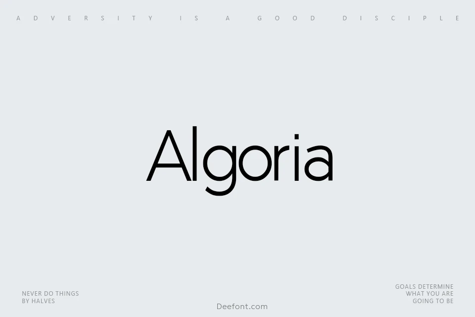 Algoria Font font is a functional sans serif typeface featuring open character openings, a uniform distribution of white and black, and excellent readability. Its general neutrality is complemented by elegant details crafted with mathematical precision, making it suitable for a wide range of design tasks, especially those requiring a quality corporate font.