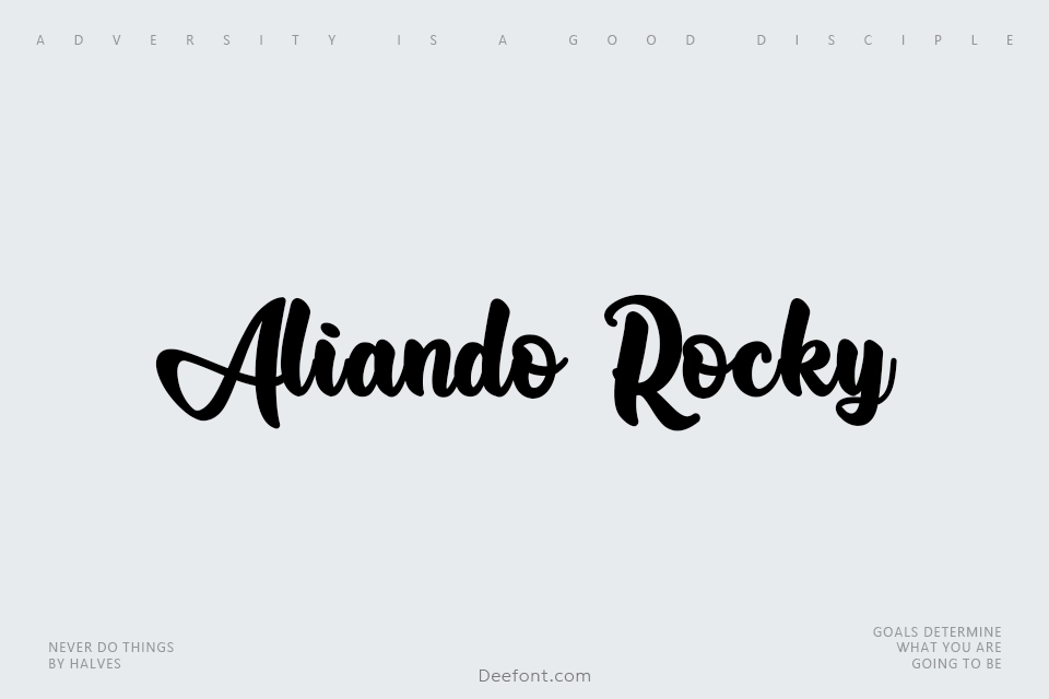 Aliando Rocky is a bold and expressive script font featuring flowing, cursive forms with a playful and energetic vibe. Designed by Kotak Kuning Studio, this decorative typeface showcases dynamic uppercase letters and rounded lowercase characters perfect for creative branding, invitations, posters, and social media graphics. With 102 carefully crafted glyphs, the font combines contemporary flair with distinctive personality, making it ideal for projects requiring an eye-catching and versatile design element that balances creativity with readability.