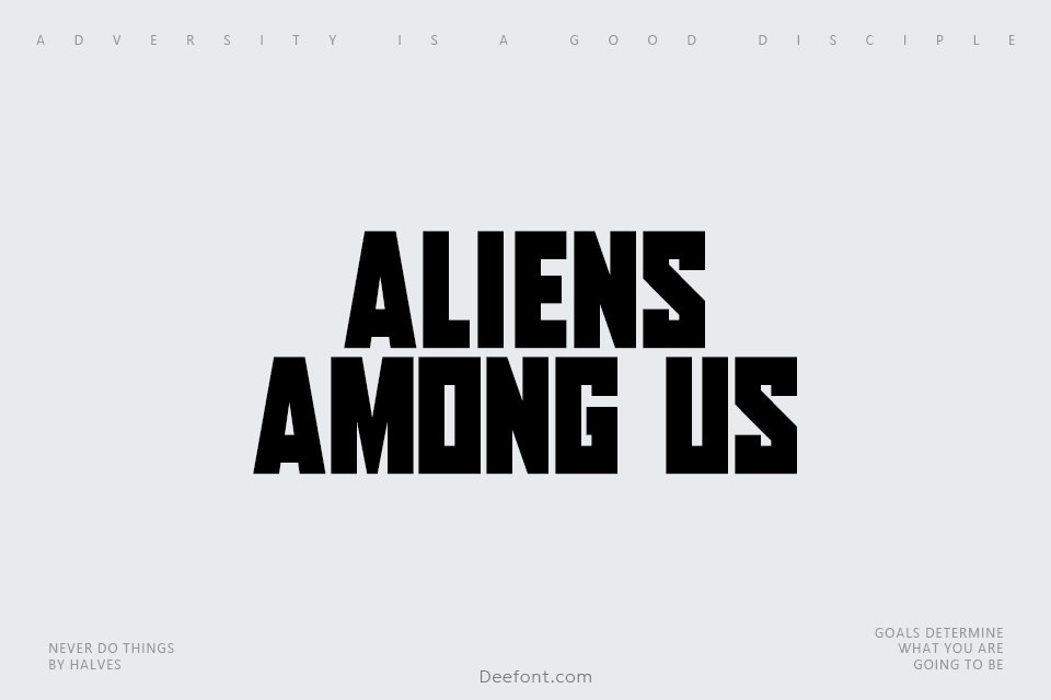 Aliens Among Us is a bold, geometric display font with sharp edges and angular shapes designed to evoke futuristic and extraterrestrial themes. Created by Darrell Flood, this striking typeface features blocky characters with a modern, sci-fi aesthetic, making it ideal for headlines, logos, posters, and techno-themed projects. With its unique geometric style and attention-grabbing design, Aliens Among Us brings an out-of-this-world dimension to any creative project requiring a bold, contemporary feel.