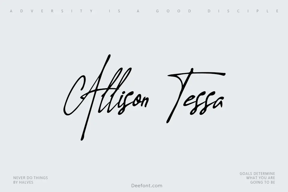 Allison Tessa is a sophisticated script typeface that combines flowing handwritten elegance with contemporary design sensibilities. Featuring smooth, naturally-curved letterforms with organic strokes, this display font excels in creating refined visual identities for high-end projects. The font’s graceful nature makes it ideal for wedding invitations, luxury packaging, decorative titles, greeting cards, and personal branding applications. With its signature-like characteristics and premium aesthetic, Allison Tessa brings an understated sophistication to any creative work requiring distinctive typography.