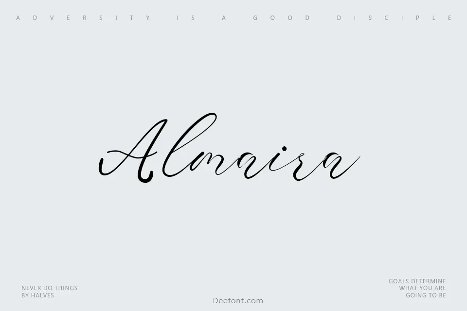Almaira Font is a thin handwritten script with sketch-like curves, soft contrast and flowing connections, ideal for Ramadhan posters, greeting cards, feminine branding, packaging, wedding invitations, inspirational quotes and stylish social media graphics where an elegant handcrafted look is essential.