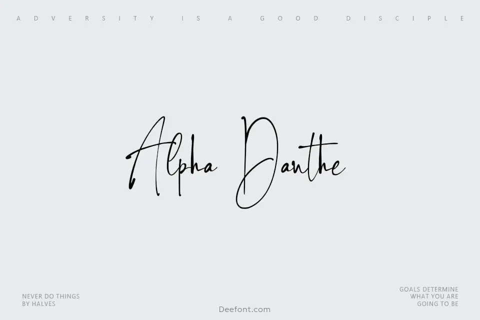 Alpha Danthe is a stunning decorative script typeface that combines handwritten charm with sophisticated elegance. Featuring ornamental swash elements and refined letterforms, this font excels in creating eye-catching titles, wedding invitations, greeting cards, and artistic lettering. The design includes special decorative commands—use curly brackets {} to add ornamental flourishes and underscores _ for elegant swash variations. With 931 glyphs, Alpha Danthe provides extensive character support for creative professionals, social media designers, and branding projects requiring refined, artistic typography.