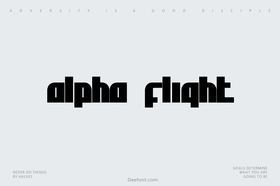 Alpha Flight is a futuristic techno and sci-fi display font featuring sharp angles, thick lines, and bold letterforms that convey a sense of motion and power. Influenced by a Commodore 64 AFL logo design, this typeface delivers a distinctly retro-futuristic aesthetic perfect for superhero comics, video games, gaming interfaces, and any project requiring an eye-catching, dynamic visual impact with a unique space-age atmosphere.
