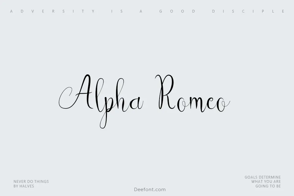 Alpha Romeo is a sophisticated handwritten script font designed by Kurniawan. Characterized by its light weight and fluid strokes, this typeface exudes elegance and personal charm. It is an excellent choice for wedding invitations, branding projects, and social media graphics where a natural, signature-style aesthetic is desired. Its versatile design ensures readability while maintaining a distinct, artistic flair.