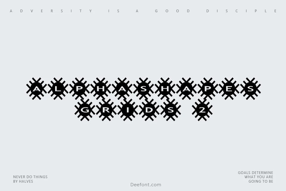 AlphaShapes grids 2 is a bold, geometric display typeface featuring each letter encased within distinct grid patterns. The sharp lines and solid fills contrast dramatically with crisp lettering, creating a striking, mechanical aesthetic that speaks of structure, precision, and modern design. Perfect for contemporary design projects seeking a unique visual texture and geometric appeal.