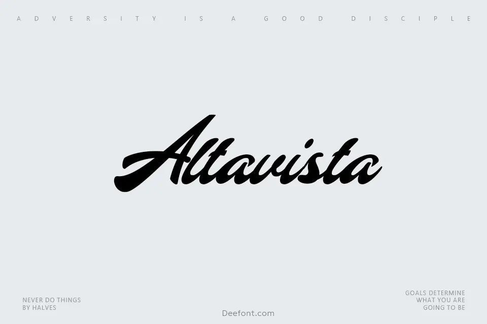 Altavista is a sophisticated script display font that combines flowing elegance with vintage charm. Featuring 290 carefully crafted glyphs including accents and Euro currency support, this typeface delivers distinctive letterforms perfect for poster designs, title text, and decorative applications. The ornate script style exudes an old-school aesthetic that evokes nostalgia while maintaining contemporary visual appeal, making it an excellent choice for designers seeking retro-inspired typography for creative projects and branding initiatives.