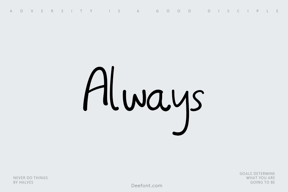 Always is an elegant handwritten script font designed for creative professionals and design enthusiasts. This versatile typeface combines contemporary style with timeless calligraphic charm, making it perfect for invitations, branding, logos, and social media graphics. With smooth, natural letterforms and playful character, Always brings a personal touch to any project while maintaining professional appeal across diverse design applications.