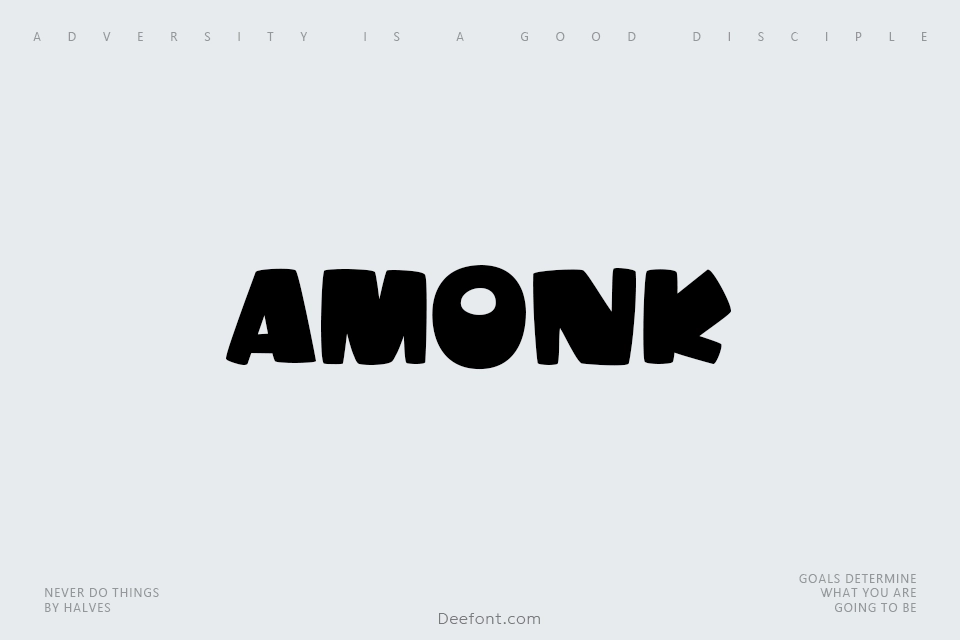 Amonk is a bold, playful display font featuring rounded characters with a comic-inspired aesthetic. Created by Kong Font, this decorative typeface showcases chunky, friendly letterforms perfect for headlines, invitations, posters, and branding projects. With its whimsical charm and contemporary style, Amonk brings vibrancy to any creative design. The font includes multiple decorative variants, including Blood and Ice versions that add unique visual flair to typography projects.