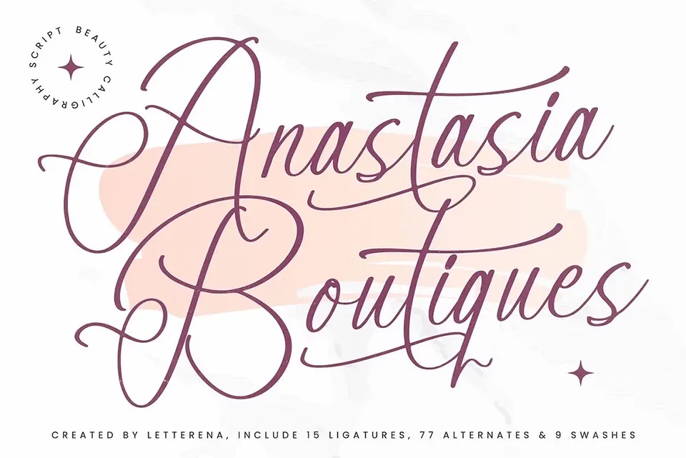 Anastasia Boutiques Font is a luxury calligraphy script font designed for elegant and creative projects. With its beautiful ligatures, alternates, and swashes, this font is perfect for logos, branding, packaging, homeware, quotes, posters, and more. Its refined curves and stylish details add a touch of sophistication and charm to any design, making it an excellent choice for those seeking a blend of beauty and versatility in their typography.