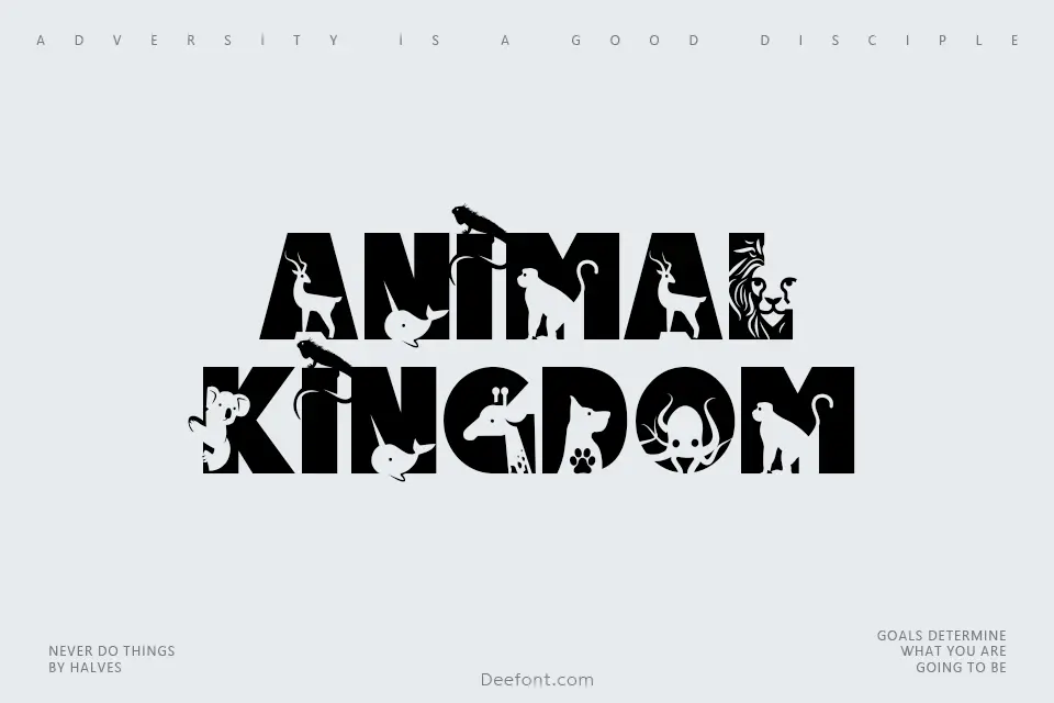 Animal Kingdom is a playful and whimsical decorative display font featuring animal silhouettes cleverly integrated within each letter. Designed with imaginative details, this font incorporates various animal shapes like elephants, flamingos, and cats into its letterforms, creating bold and eye-catching characters. Perfect for children’s books, educational materials, zoo-themed posters, playful branding, and creative projects that require a fun and engaging visual touch. The font’s intricate design and distinctive style make it an excellent choice for headlines, logos, and themed design work.